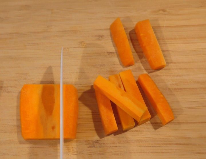 にんじんは皮をむき、約1cm角の拍子木切りにします。