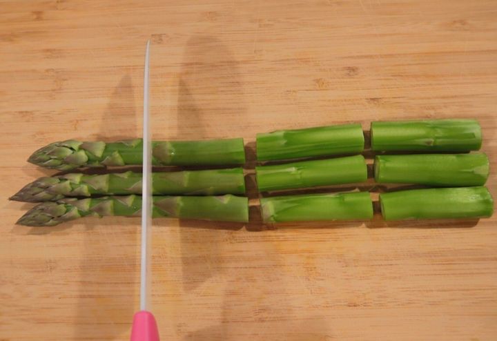 アスパラガスは根元のかたい部分(1.5cmほど)を切り落とし、根元から長さの半分くらいまでのかたい皮をピーラーでむきます。