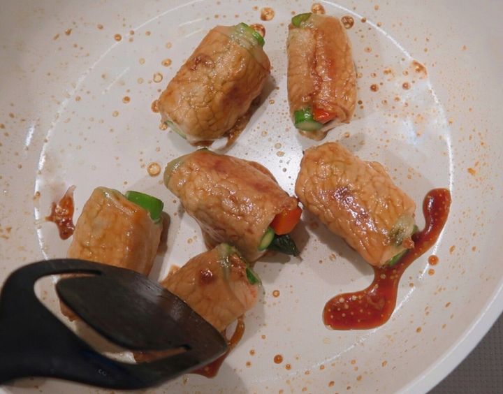 フライパンにごま油(小さじ1)を中火で熱し、(2)を巻きおわりが下になるようにのせて焼きます。