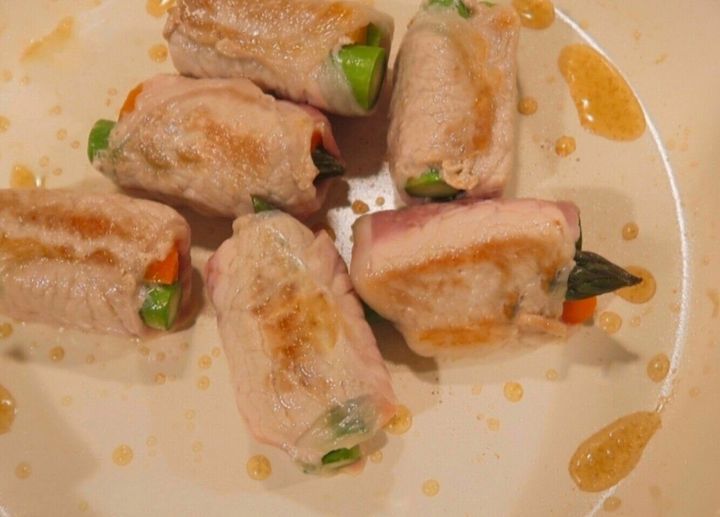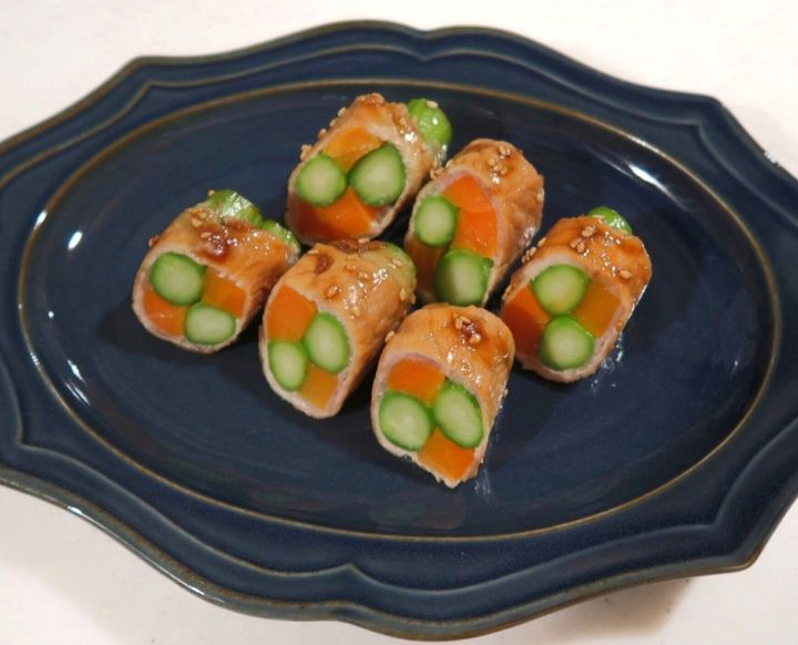 みずみずしいアスパラガスとにんじんの旨味をたっぷり味わえる「アスパラとにんじんの肉巻き」。