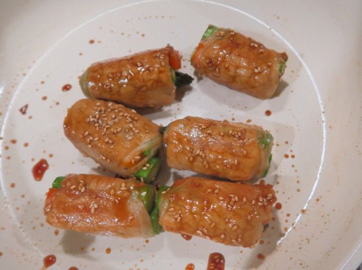 お皿に盛りつけたら「アスパラとにんじんの肉巻き」の完成です!野菜たっぷりで食べごたえのある、ヘルシーな豚肉おかずです。