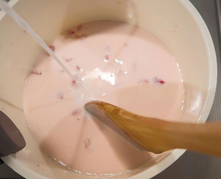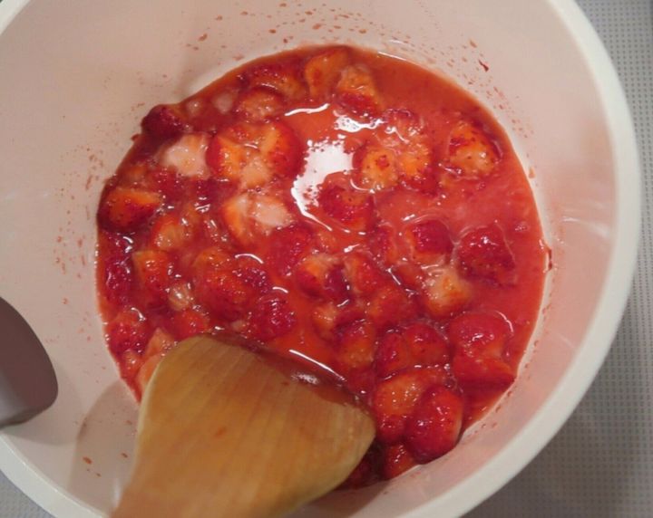 途中砂糖が溶けたら、ヘラでいちごの果肉をつぶします。