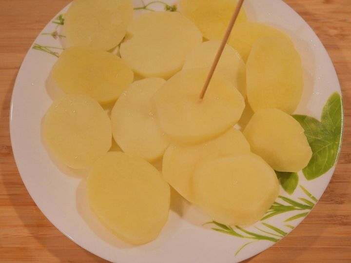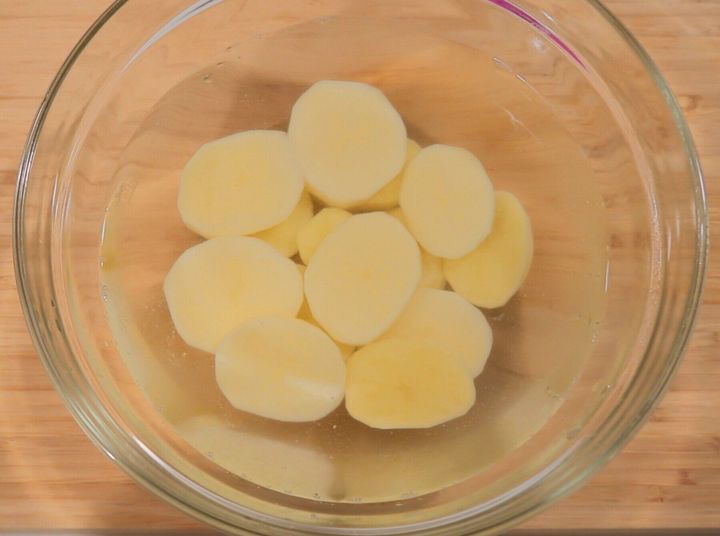 じゃがいもは皮をむいて芽を取り除き、約1cm幅の輪切りにします。