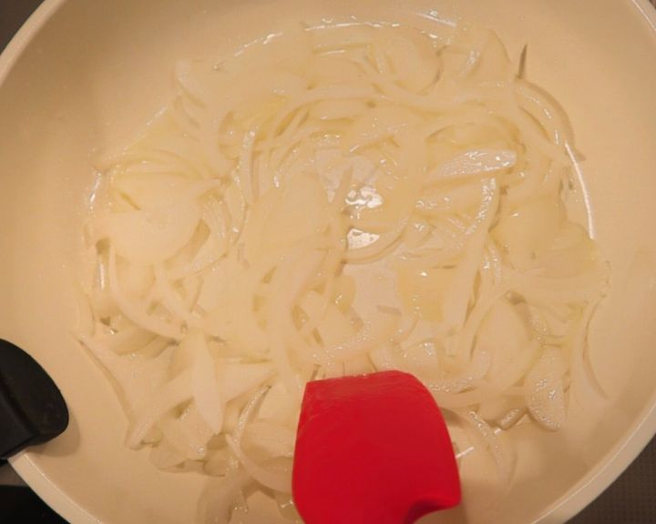 フライパンにバター半量(10g)を中火で熱し、玉ねぎを入れて約5分炒めます。じっくり炒めることで、玉ねぎの旨味を引き出します!