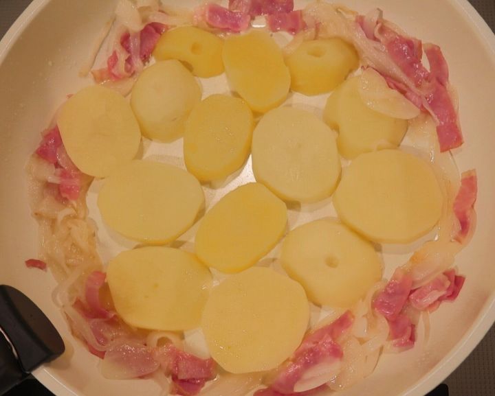 つづいてじゃがいもを並べ、中火でこんがりと焼き色がつくまで焼きます。