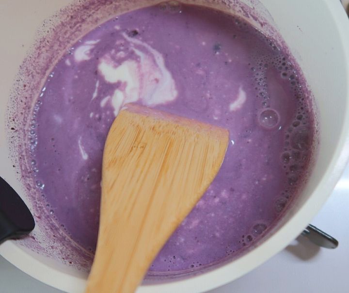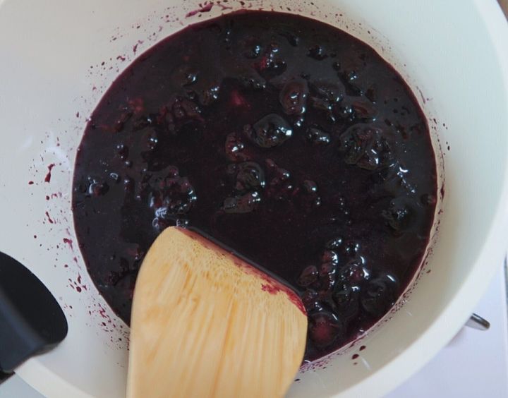 途中砂糖が溶けたら、おたまの裏(またはマッシャー)を使ってブルーベリーの果肉をつぶします。