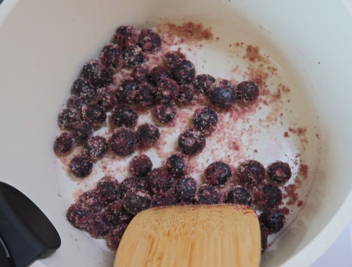 鍋に冷凍ブルーベリー、砂糖を入れて混ぜ合わせ弱火にかけます。ヘラで混ぜながら約5分加熱します。