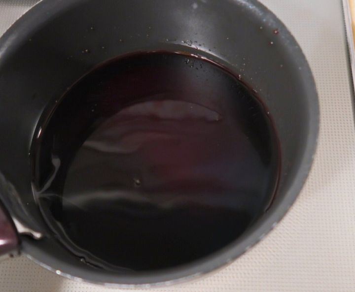 小さめの鍋に赤ワイン、水、グラニュー糖を入れ、中火で約3分加熱します。