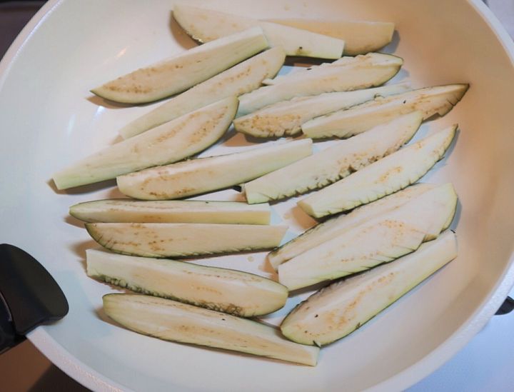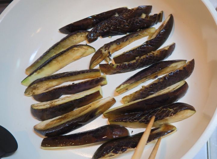 フライパンにごま油(大さじ2)を入れ、なすを皮目を下にして並べます。