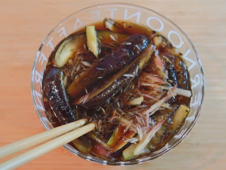 みょうがの千切りと、焼いたなすを(2)のつけ汁に浸します。