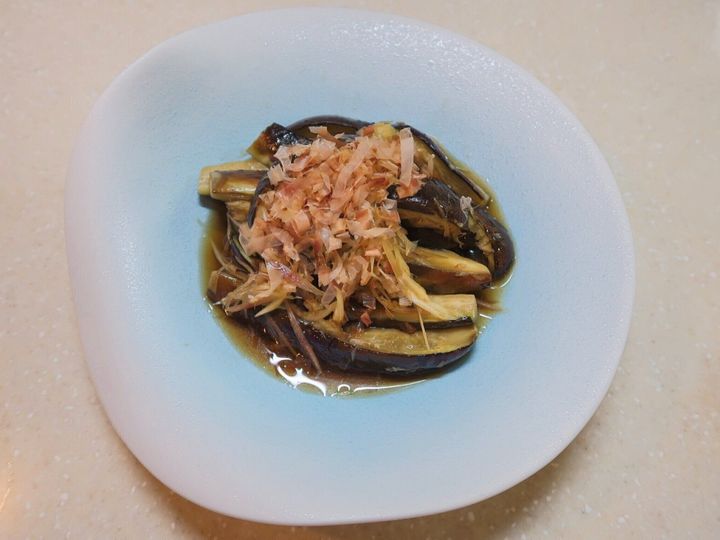 器に盛りつけ、かつお節をふりかけたら「なすの焼き浸し」の完成です!冷蔵庫で数時間置くとさらに中まで味がしみ込みおいしくいただけます。