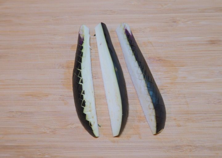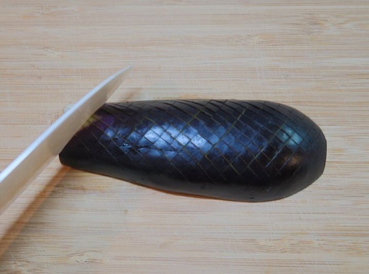 なすはヘタを取り、縦半分に切ります。つづいて切り口を下向きにしておき、包丁で浅く格子状に切り込みを入れます。