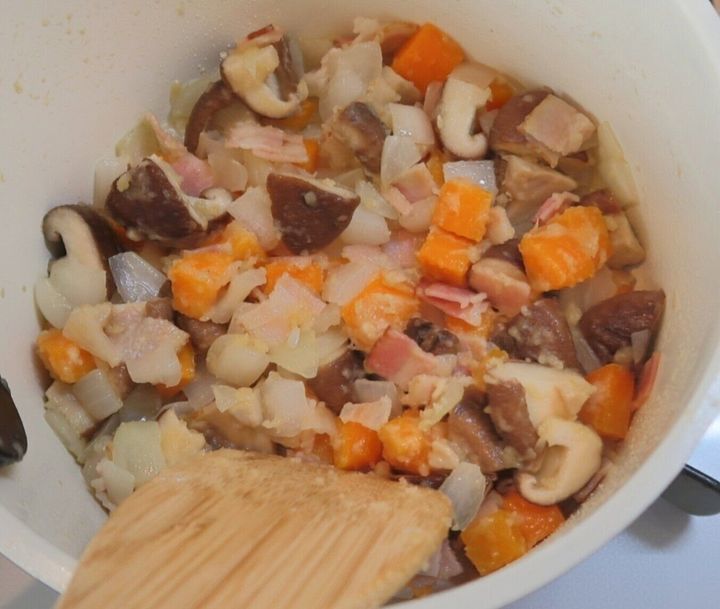 玉ねぎが透き通ったら、ベーコン、しいたけを加え中火で約5分炒めます。じっくり炒めることで具材の旨味をひきだします!