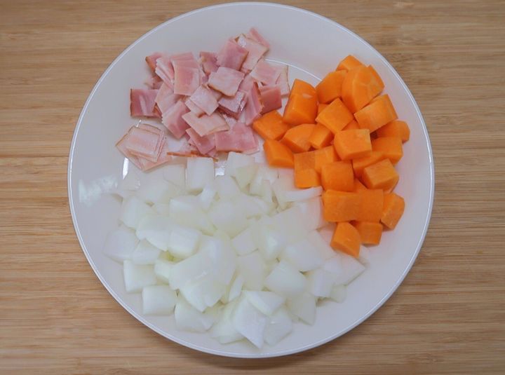 玉ねぎ、にんじん、ベーコンはそれぞれ約1cm角にカットします。