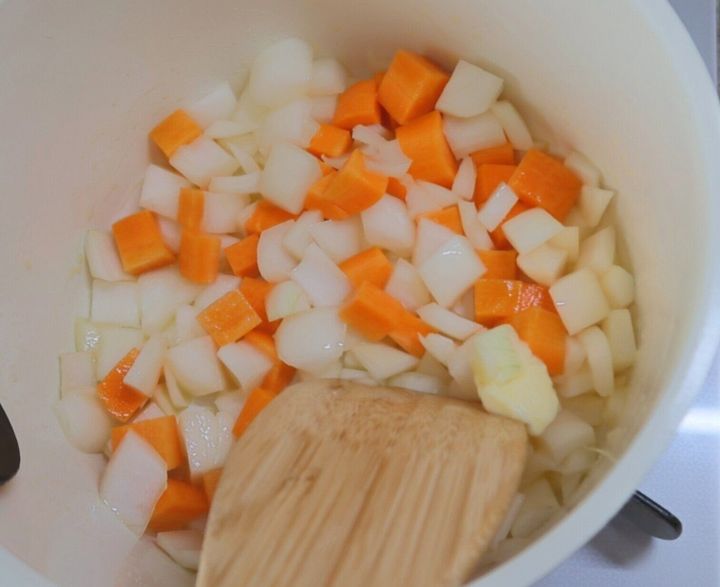 鍋にバターを中火で熱し、玉ねぎ、にんじんを入れ約3分炒めます。