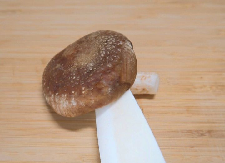 しいたけは石づきを切り落とし、軸をカットします。まな板に軸を下向きにしてのせ、かさをめくるようにすると簡単にカットすることができます!