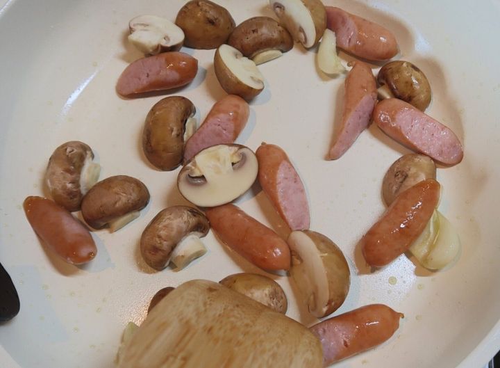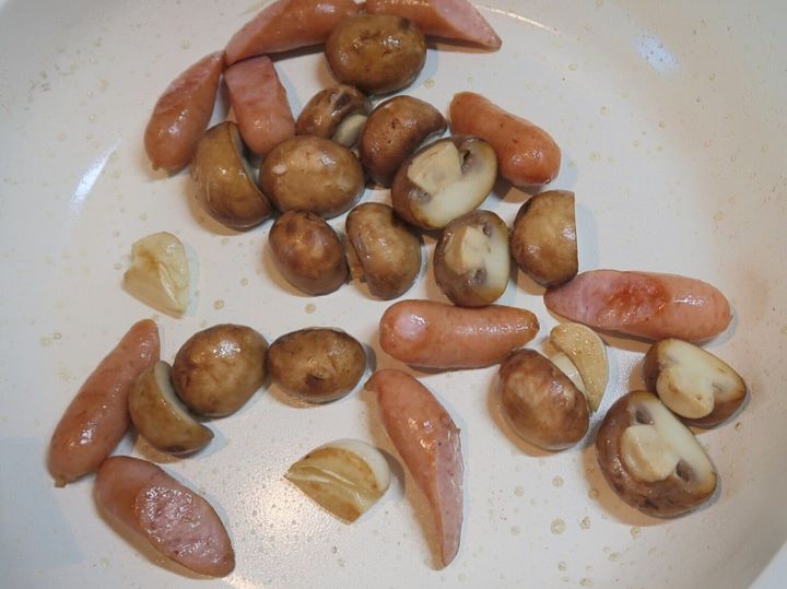 にんにくの香りがたったら、ウインナー、マッシュルームを加え、強めの中火で約4分じっくり炒めます。