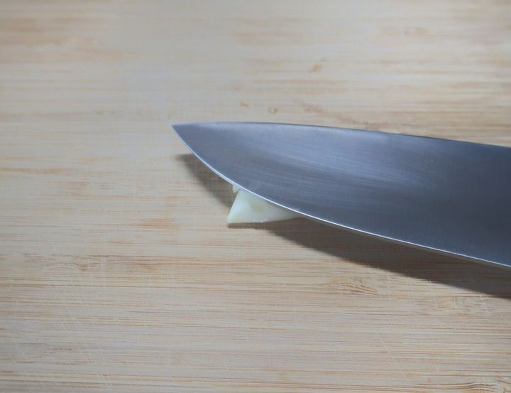 つづいて切り口を下向きにし、刃を奥に向けて包丁の腹をのせ手のひらで押しつぶします。このひと手間で、にんにくの香りが出やすくなります!