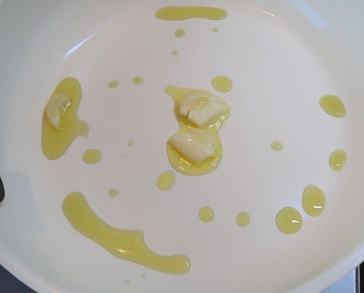 フライパンにオリーブオイルと(1)のにんにくを入れ、弱火にかけます。