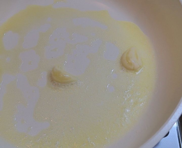 つづいて切り口を下向きにし、刃を奥に向けて包丁の腹をのせ手のひらで押しつぶします。このひと手間で、にんにくの香りが出やすくなります!