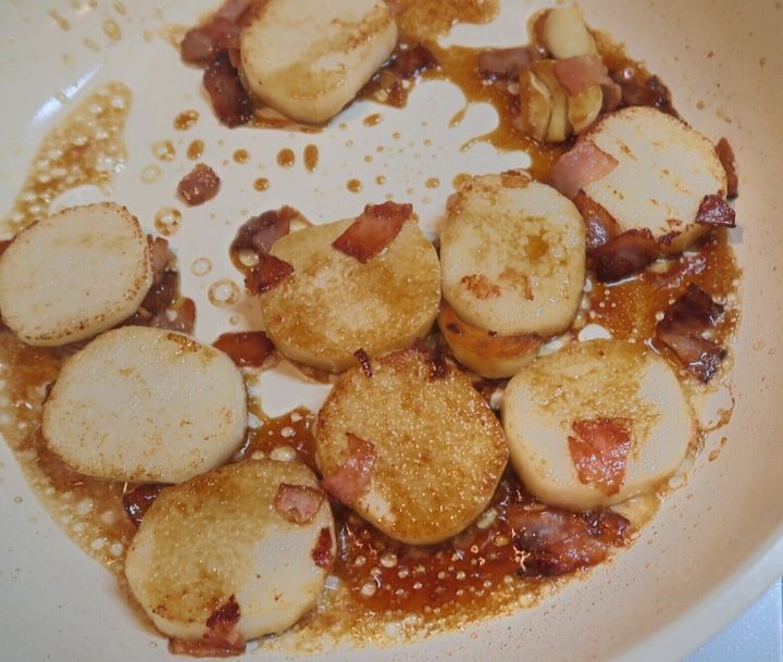 にんにくの香りが立ったら、長芋を加え中火で約4分炒めます。にんにくと長芋に焼き色がついたら裏返し、ベーコンを加えて再び焼き色がつくまでじっくりと焼きます。
