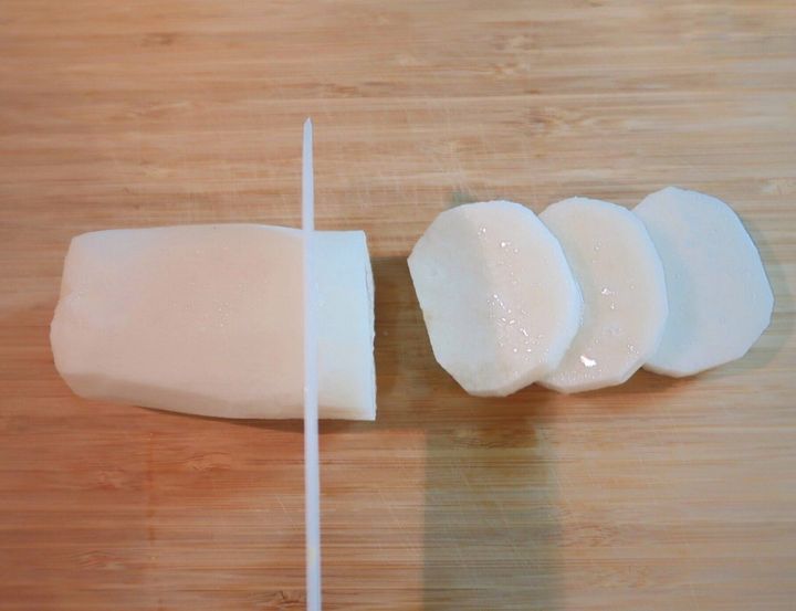 長芋はピーラーで皮をむき、両端を切り落として約1cm幅の輪切りにします。