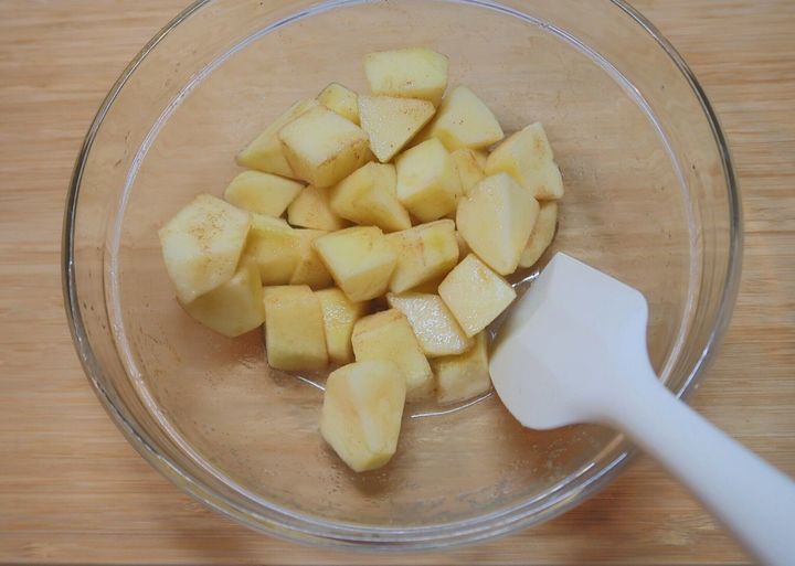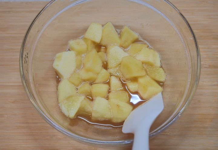 耐熱のボウルに(1)のりんご、砂糖、レモン汁、シナモンパウダー(お好みで)を加え全体を混ぜ合わせます。