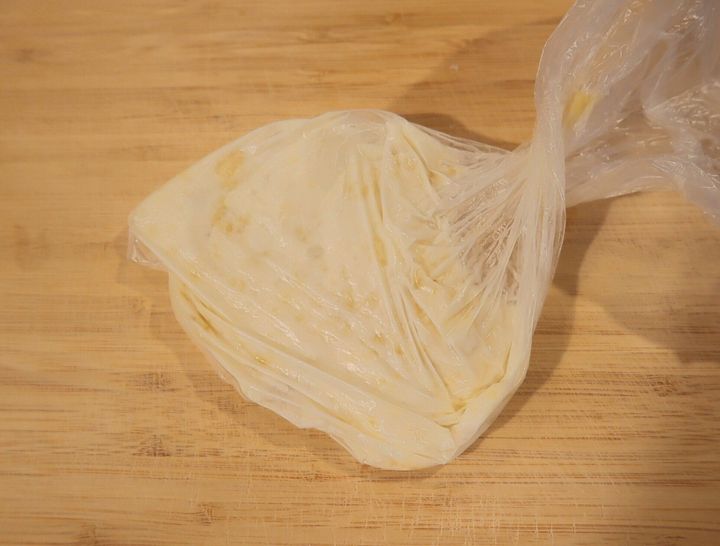 バナナは皮をむいてポリ袋に入れ、なめらかになるまでもみ込みます。つづいてプレーンヨーグルト(大さじ3)を加え、さらに全体が均一になるまでもみ込みます。