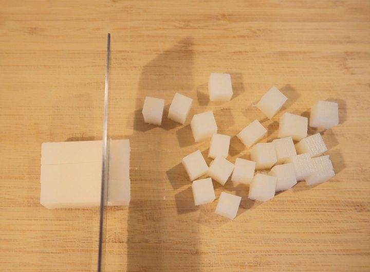 切り餅は約1cm角にカットし、大きめの耐熱ボウルに入れます。