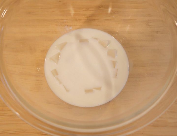 牛乳(120ml)を加えて混ぜ合わせ、ふんわりとラップをかけて電子レンジ(600w)で約3分30秒加熱します。