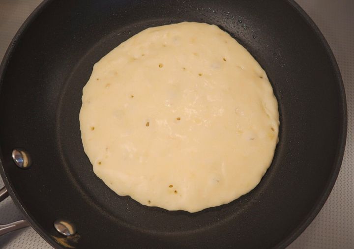つづいて生地の1/4量を流し入れ、弱火でじっくりと焼きます。