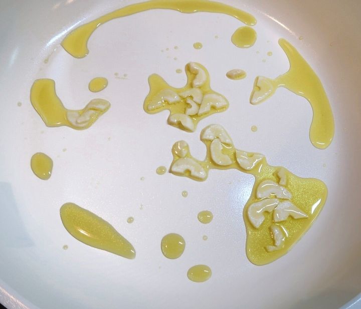 フライパンにオリーブオイル(大さじ1)、にんにくを入れ弱火にかけます。