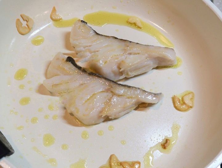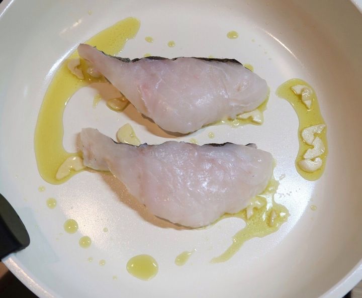 にんにくの香りが立ったら中火にし、(1)のタラを皮目を下にして並べます。