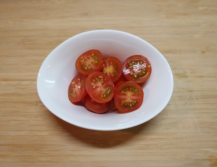 ミニトマトはヘタを取り除き、水洗いしてキッチンペーパーで水気をふきとります。つづいて半分にカットします。