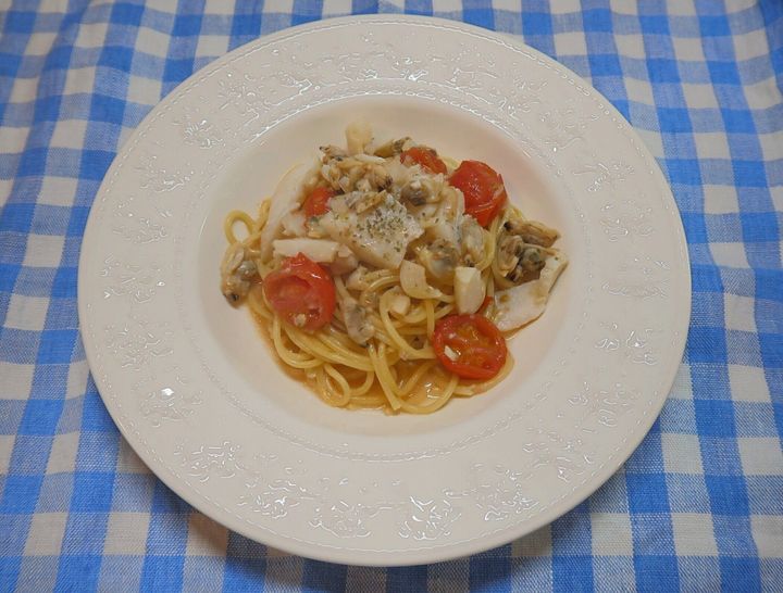 あさりの水煮缶と、旬のタラを使った「タラとあさりのアクアパッツァ」。