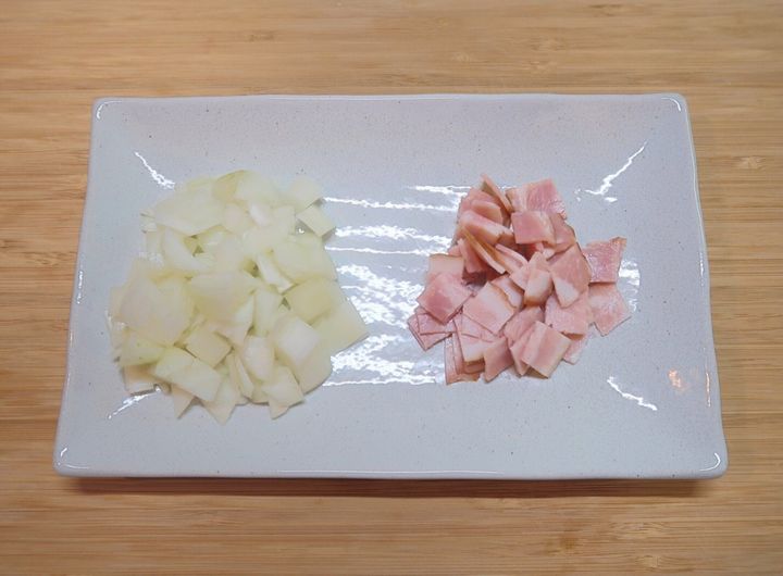 玉ねぎ、ベーコンはそれぞれ約1cm角にカットします。