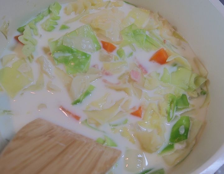 牛乳(500ml)を2回に分けて加え、そのつどよく混ぜ合わせます。コンソメキューブを加え、強めの中火で沸騰直前まであたためてから弱火にし、ときどき混ぜながら約15分煮込みます。
