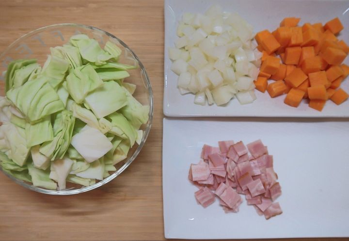 玉ねぎ、にんじん、ベーコンは、それぞれ約1cm角に切ります。
