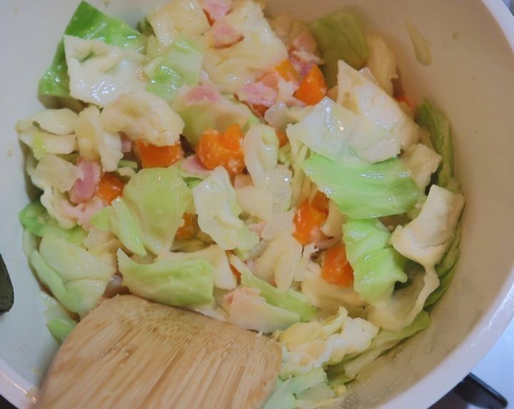 鍋にバターを中火で熱し、玉ねぎ、にんじん、ベーコンを加え約5分炒めます。じっくり炒めることで、具材の旨味を引き出します。