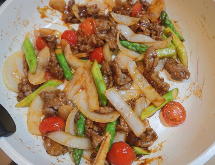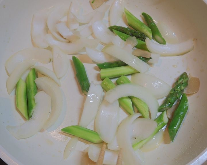 しょうがの香りが立ったら、玉ねぎ、アスパラガスを加え、中火で約3分炒めます。