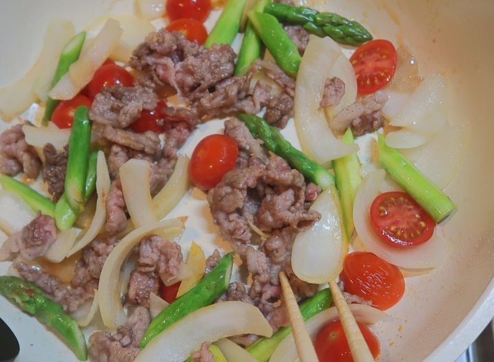 つづいてミニトマト、炒めた牛肉を加え、中火で約1分炒めます。