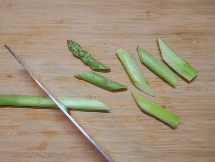 アスパラガスは根元のかたい部分(1.5cmほど)を切り落とし、根元から長さの半分くらいまでの皮をピーラーでむきます。