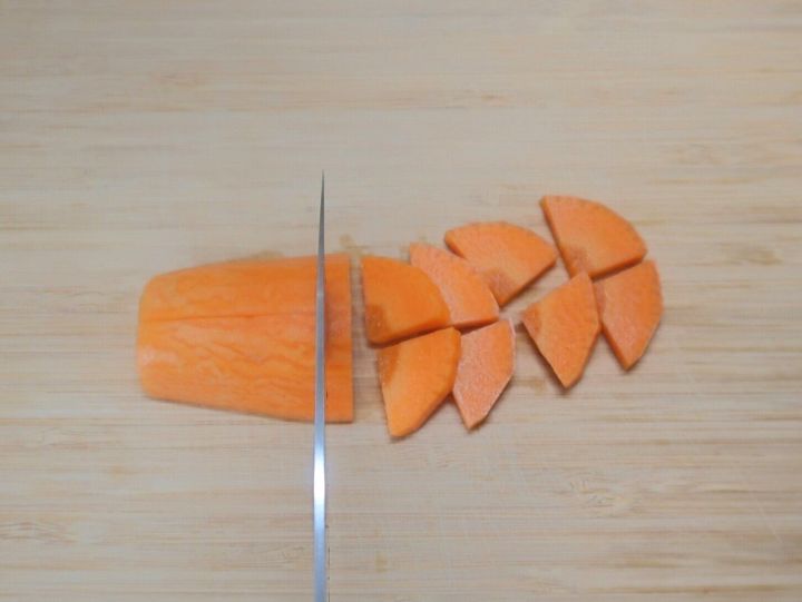 にんじんは皮をむいて、約3mm厚のいちょう切りにします。