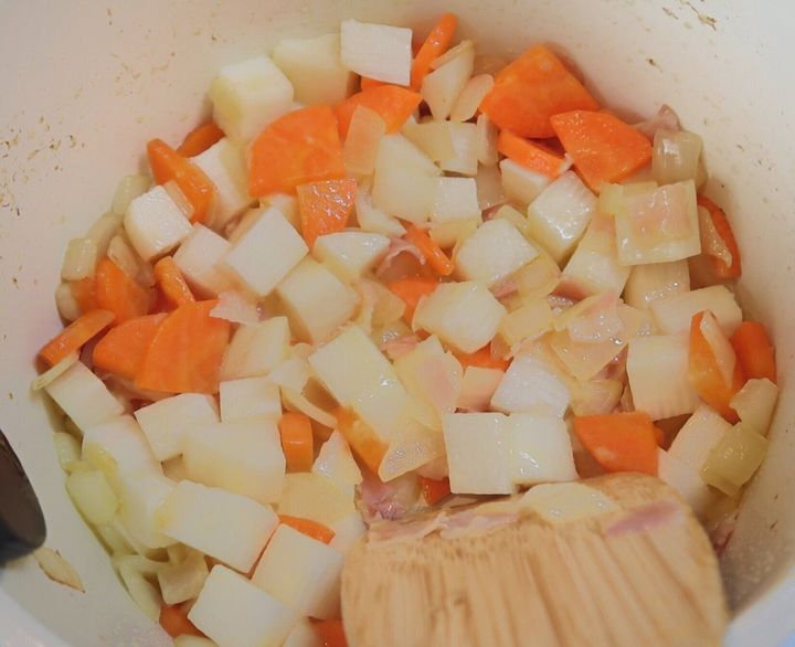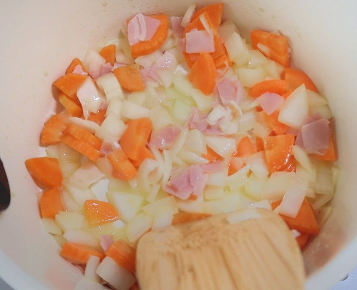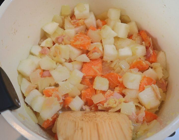 鍋にバターを中火で熱し、玉ねぎ、にんじん、ベーコンを加え4〜5分炒めます。じっくり炒めることで、具材の旨味を引き出します!