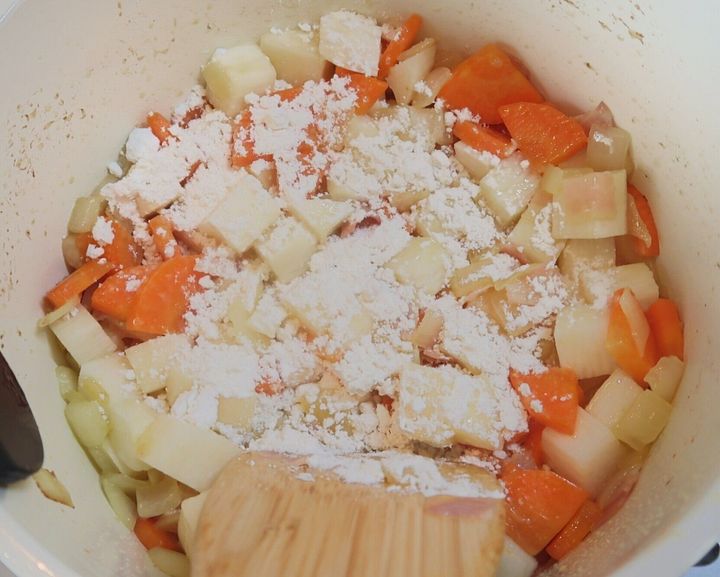 薄力粉(大さじ1)をふり入れ、弱火で約1分炒めます。