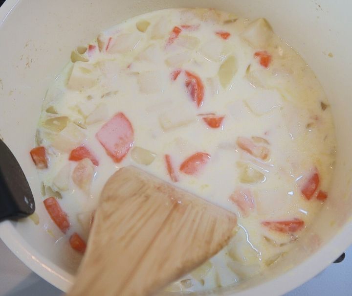 コンソメキューブを加え、強火で沸騰直前まであたためてから弱火にし、ときどき混ぜながら約10分煮込みます。