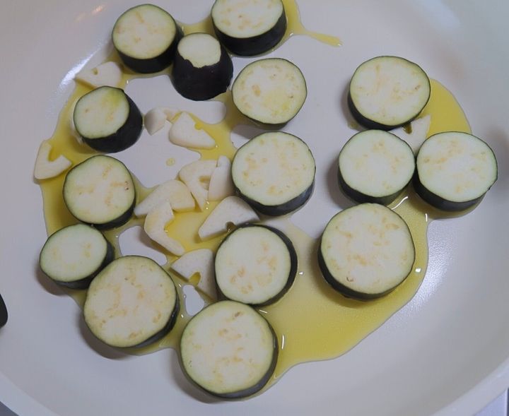 フライパンにオリーブオイル(大さじ2)、にんにくスライスを入れ、なすを重ならないように並べます。