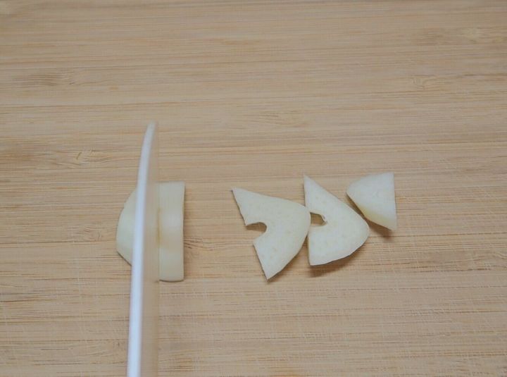 にんにくは皮をむき、たて半分にカットして芽を取り除きます。つづいて切り口を下向きにして約5mm厚にスライスします。