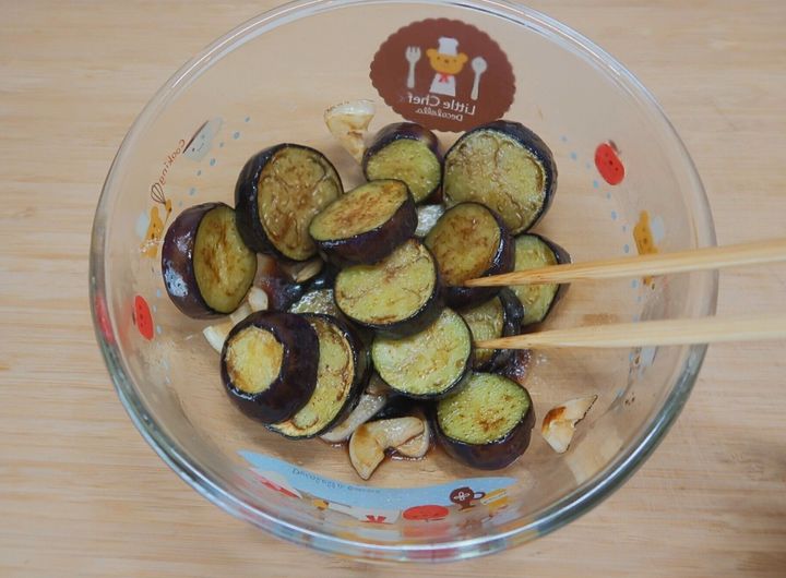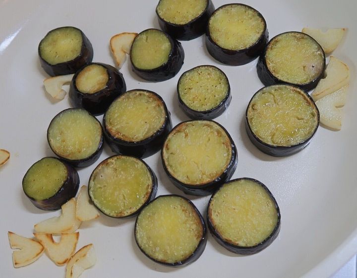 なすにうっすらと焼き色がついたら、なすとにんにくを裏返します。弱めの中火にし、さらになすに火が通るまで加熱します。