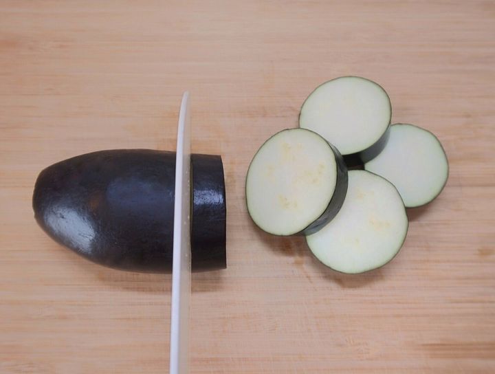 なすは両端を切り落とし、約1cm幅の輪切りにします。